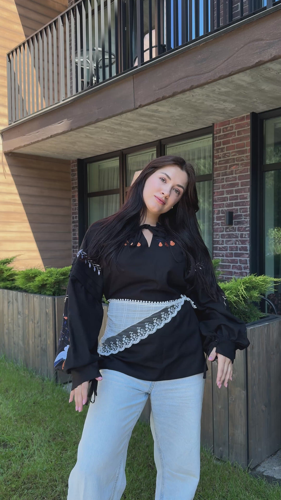 Жіноча вишиванка "Лелеки" чорна | Hrushenka