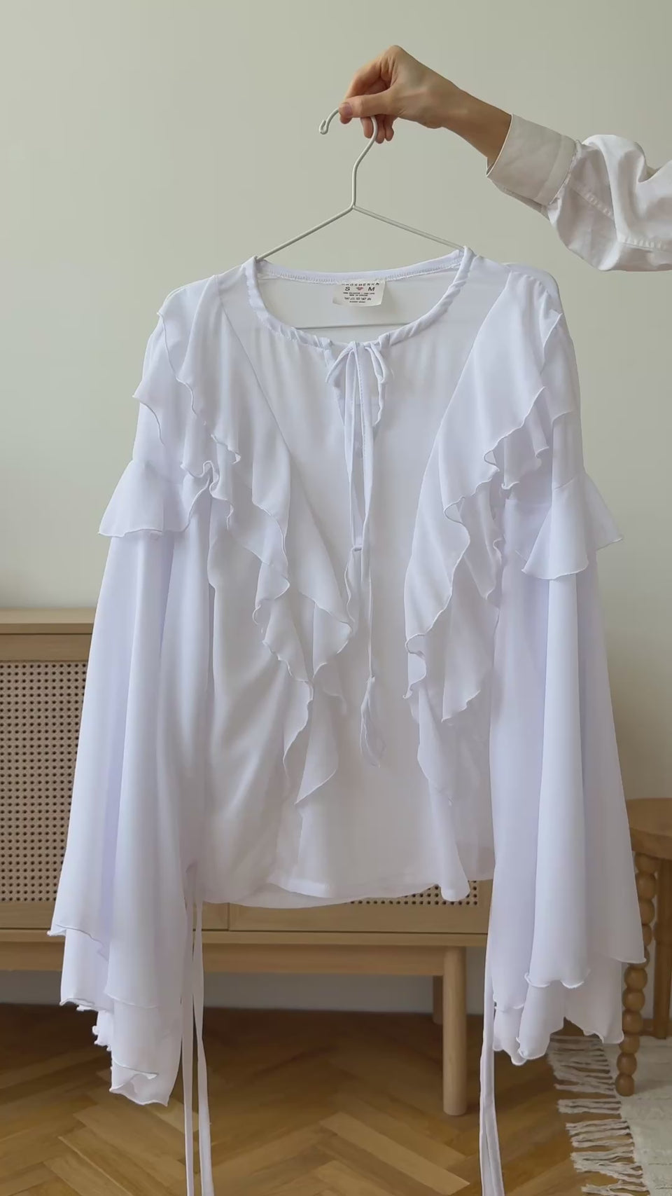 Жіноча біла сорочка з рюшами - відкриє для Вас витонченість і елегантність. Прикрашена рюшами з ефектом хвиль. Ця стильна сорочка виготовлена з легкого і прозорого шифону, що створює невимушений і повітряний вигляд.