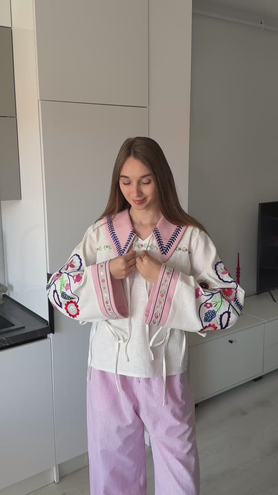 Жіноча вишиванка "Барви душі" біло-рожева, створена за мотивами картин Ганни Собачко-Шостак, — це продовження та розгортання її барвистого світу на полотні одягу. Вона доповнює однойменну спідницю, створюючи цілісний ансамбль, де кожен стібок — мов штрих пензля, кожен орнамент — живий відгомін народної уяви.