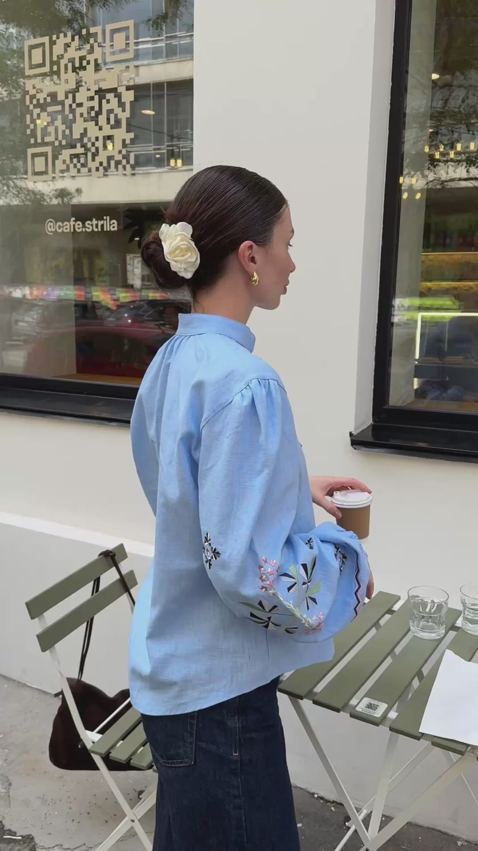 Жіноча вишиванка "Каштан" блакитна — це ніжна ода Києву, весні й спогадам дитинства. Каштанові суцвіття, вишиті на рукавах і грудях, символізують не лише красу природи, а й глибоку прив’язаність до рідної землі, міста, вулиці, де зацвітає пам’ять.